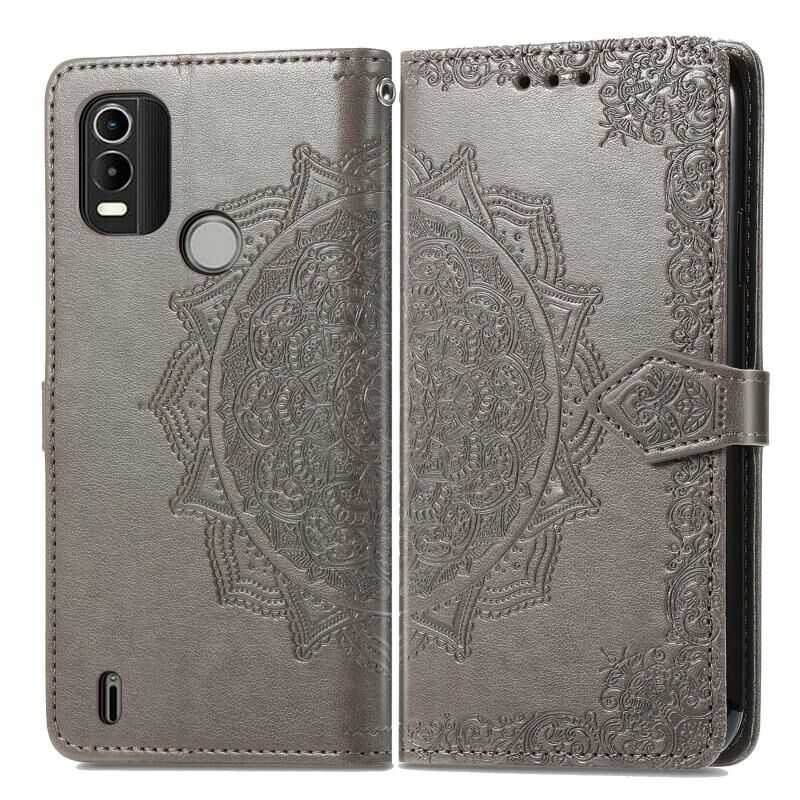 Για το Nokia C21 Plus Mandala λουλούδι ανάγλυφο δερμάτινη θήκη τηλεφώνου (γκρι)