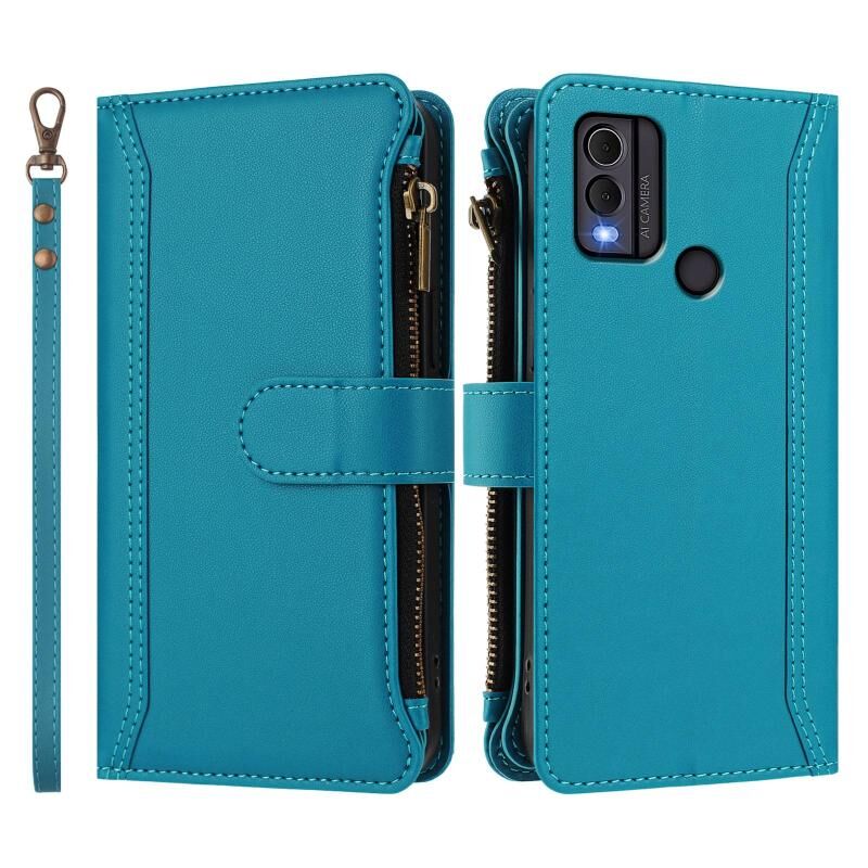 For Nokia C22 Magnetic Closure 9 Card Slots Zipper Leather Case with Hand Strap(Turquoise)