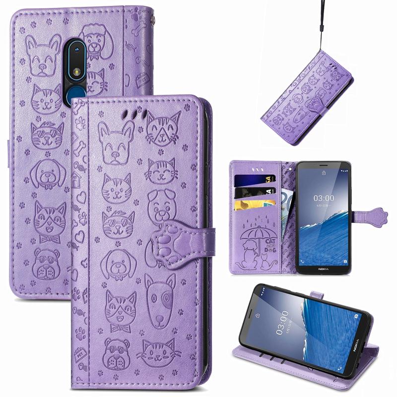 For Nokia C3 Cute Cat and Dog Embossed Flip Leather Phone Case(Purple)