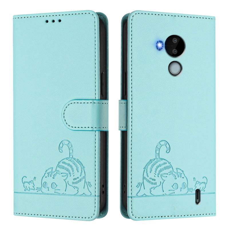 For Nokia C30 Cat Rat Embossed RFID Leather Phone Case with Lanyard(Mint Green)