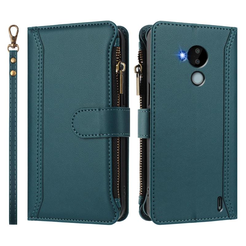 For Nokia C30 Magnetic Closure 9 Card Slots Zipper Leather Case with Hand Strap(Dark Green)