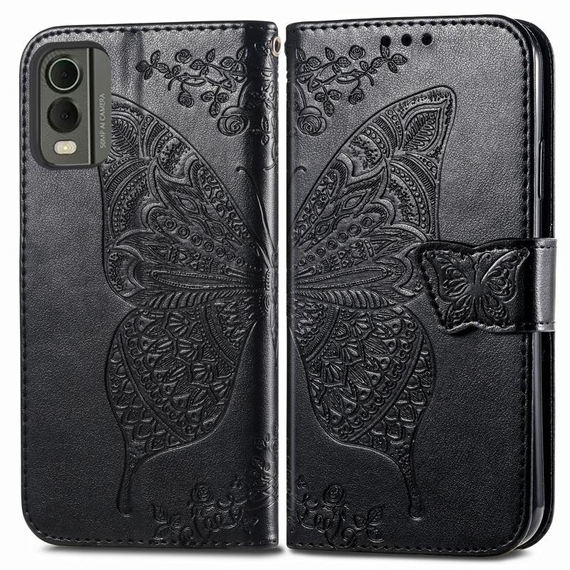 For Nokia C32 Butterfly Love Flower Embossed Leather Phone Case(Black)