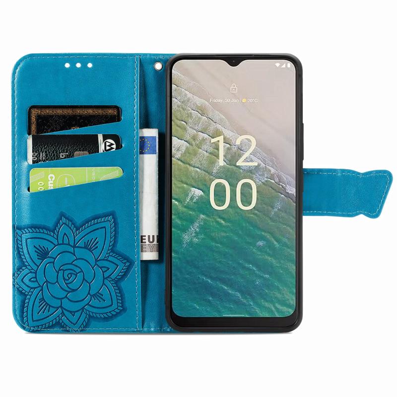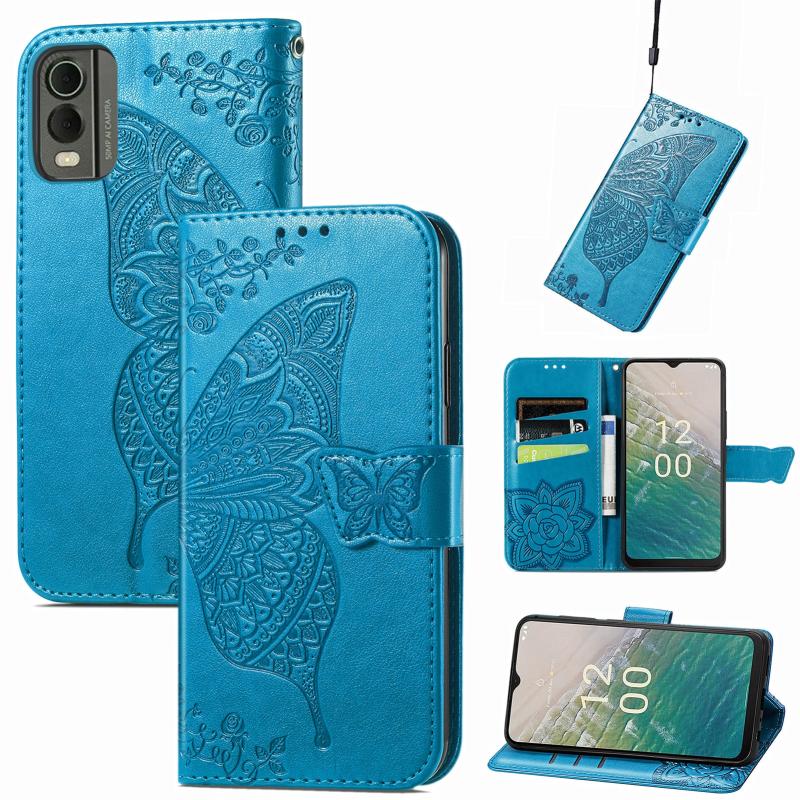 For Nokia C32 Butterfly Love Flower Embossed Leather Phone Case(Blue)