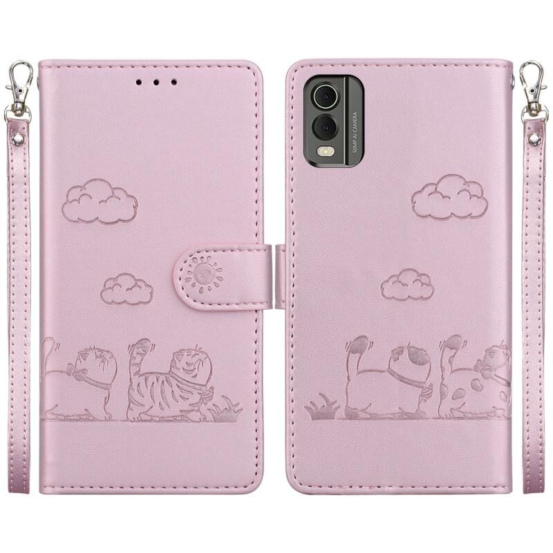 Θήκη τηλεφώνου από δέρμα RFID για Nokia C32, χαριτωμένες γάτες (Χρυσό ροζ)