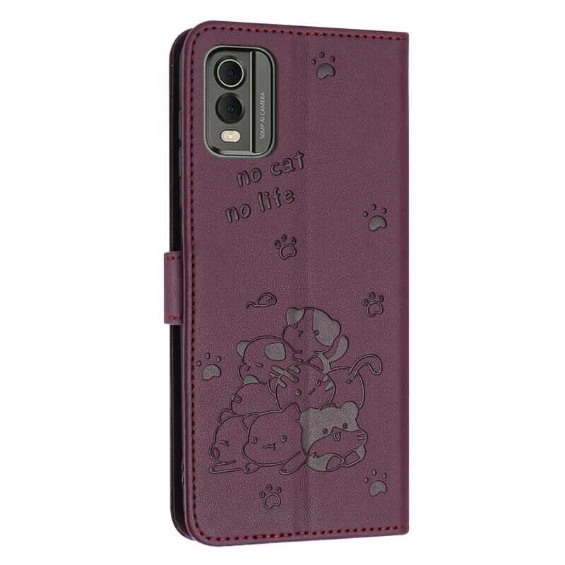 Θήκη δερμάτινη για Nokia C32 με ανάγλυφο γατάκι και κορδόνι (Μωβ)