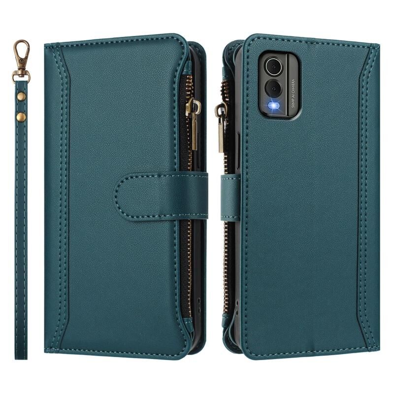 For Nokia C32 Magnetic Closure 9 Card Slots Zipper Leather Case with Hand Strap(Dark Green)