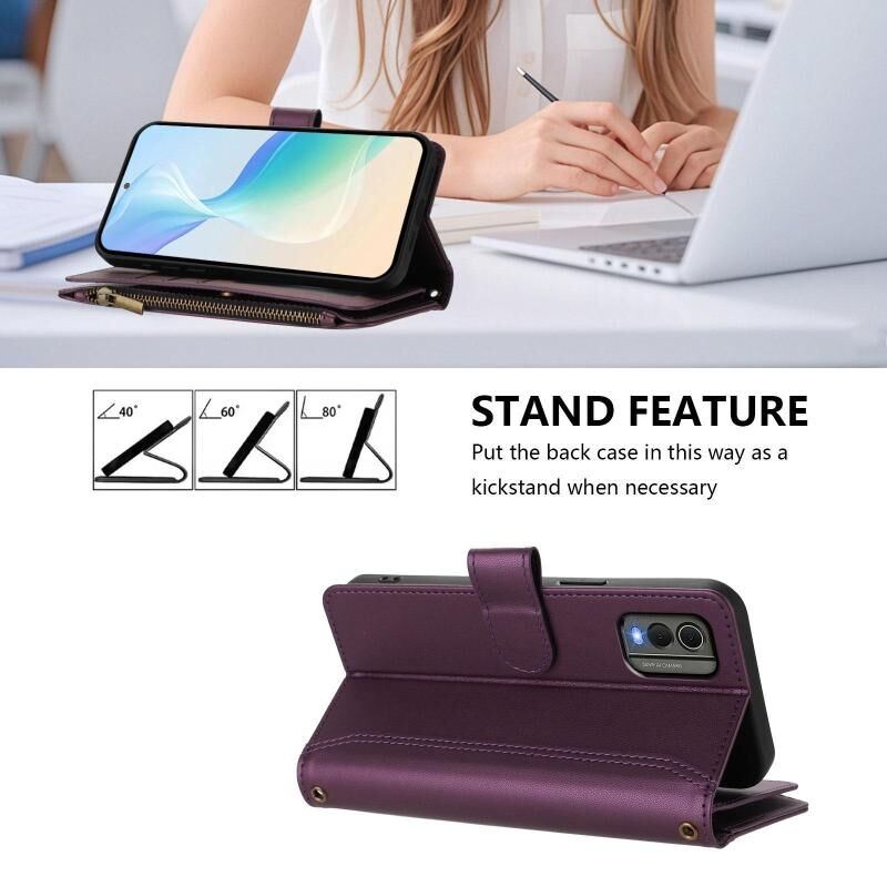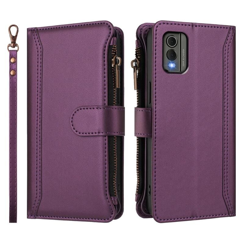 For Nokia C32 Magnetic Closure 9 Card Slots Zipper Leather Case with Hand Strap(Purple)