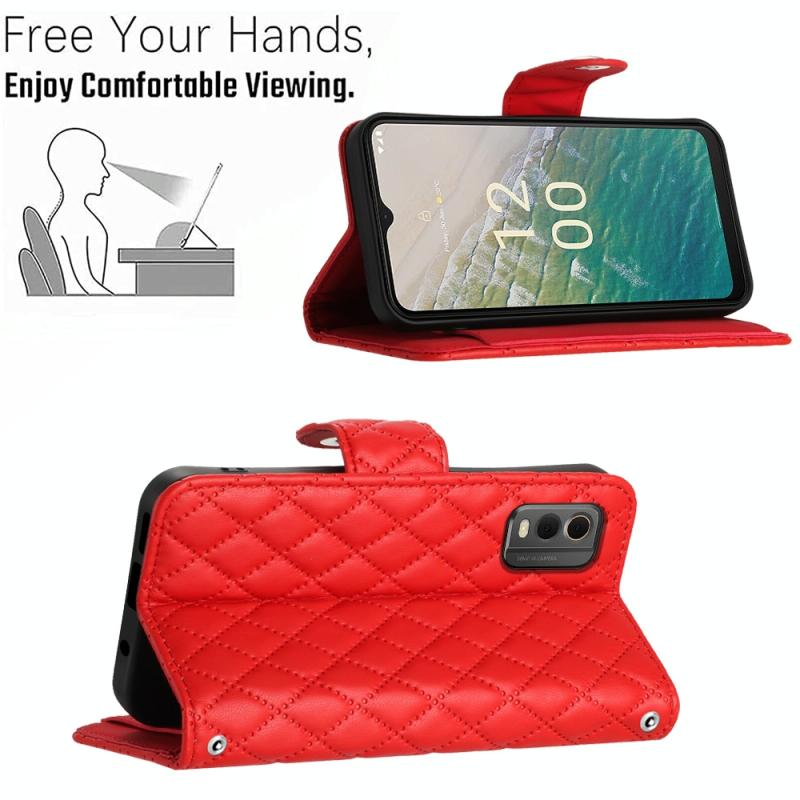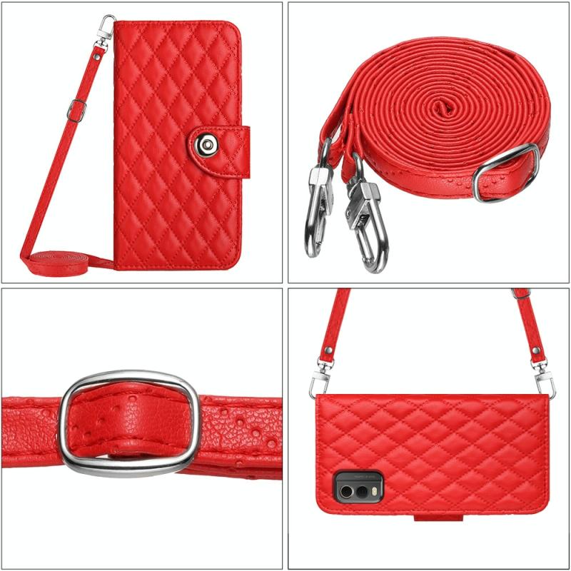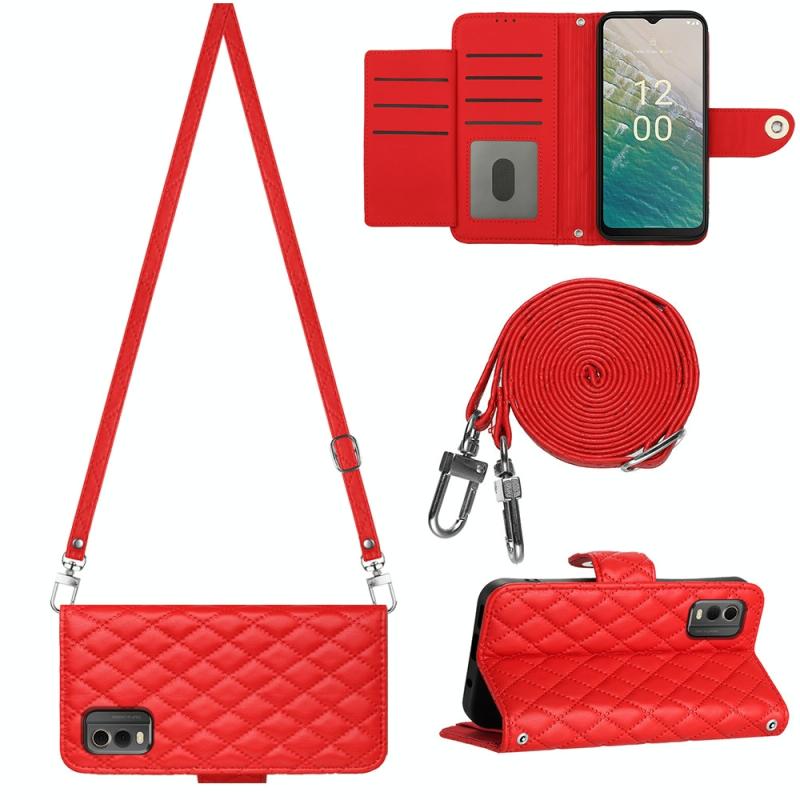 For Nokia C32 Rhombic Texture Flip Leather Phone Case with Long Lanyard(Red)