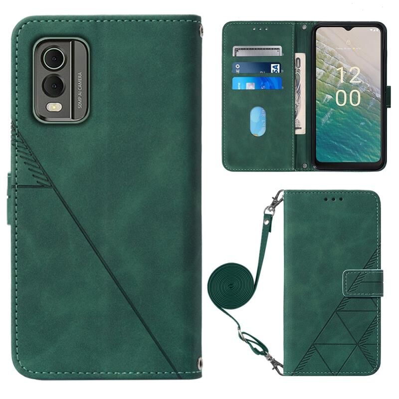 Θήκη τηλεφώνου για Nokia C32 TA-1534, δερμάτινη, τύπου flip, με ανάγλυφο 3D, για χρήση στον ώμο (Σκούρο Πράσινο)
