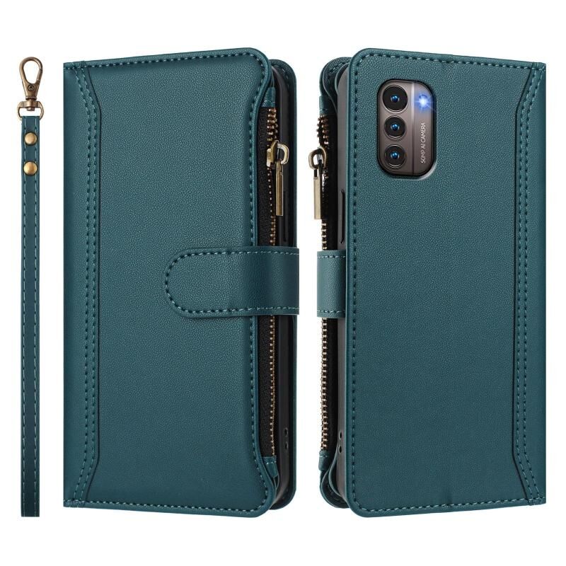 For Nokia G11 4G / G21 4G Magnetic Closure 9 Card Slots Zipper Leather Case with Hand Strap(Dark Green)