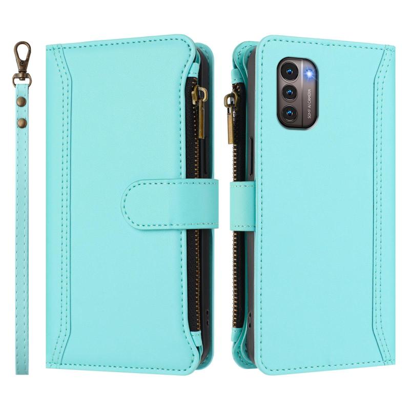 For Nokia G11 4G / G21 4G Magnetic Closure 9 Card Slots Zipper Leather Case with Hand Strap(Mint Green)