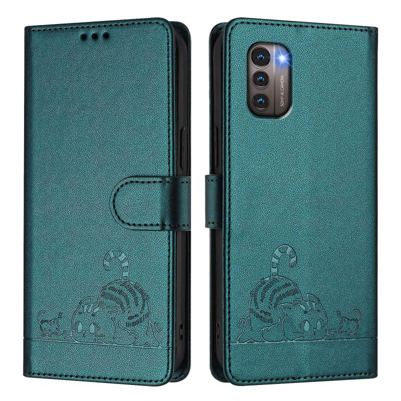 For Nokia G21 / G11 Cat Rat Embossed RFID Leather Phone Case with Lanyard(Peacock Green)