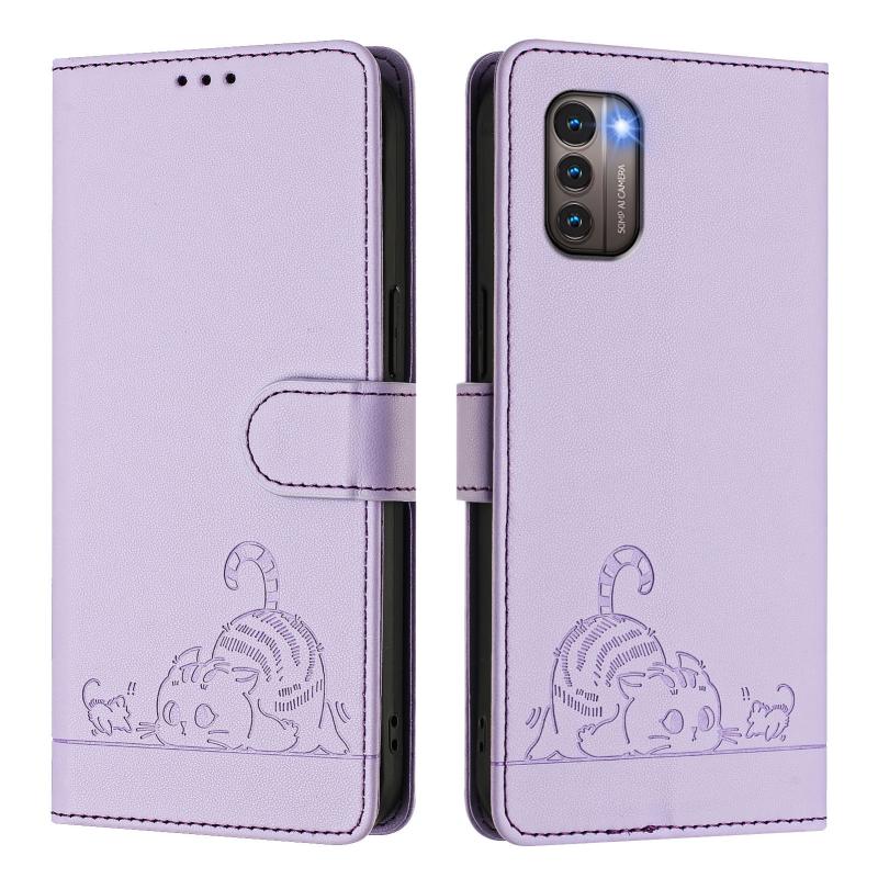 For Nokia G21 / G11 Cat Rat Embossed RFID Leather Phone Case with Lanyard(Purple)