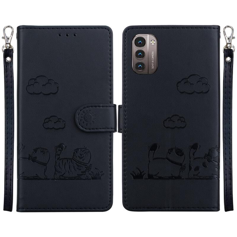 Θήκη τηλεφώνου από δέρμα με χαριτωμένες γάτες RFID για Nokia G21 / G11 (Χρυσορόδινο)