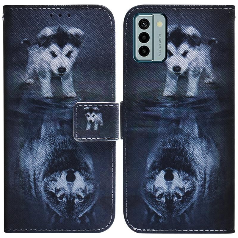 Θήκη τηλεφώνου από δέρμα με σχέδιο και αναδιπλούμενο καπάκι για Nokia G22 (Λύκος και Σκύλος)