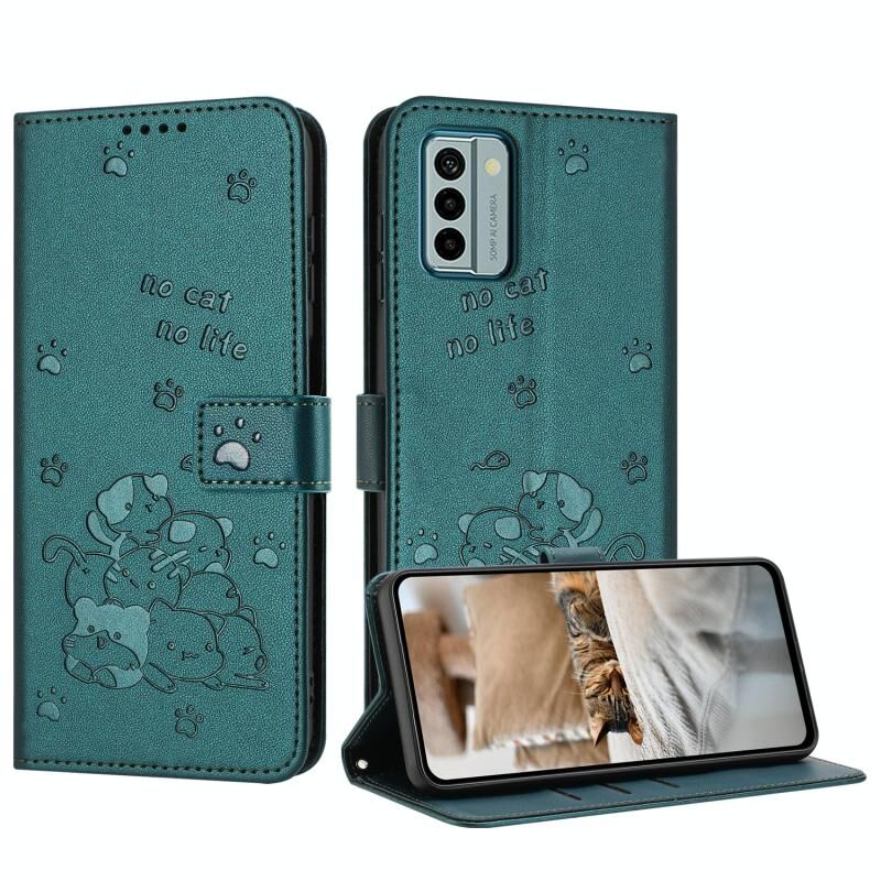 Θήκη δερμάτινη για Nokia G22 με ανάγλυφο σχέδιο γατάκι και λουρί (Σκούρο Πράσινο)