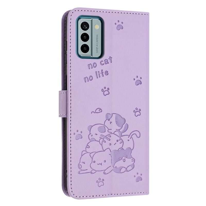 Θήκη δέρματος για Nokia G22 με ανάγλυφο γατάκι και κορδόνι (Μωβ)