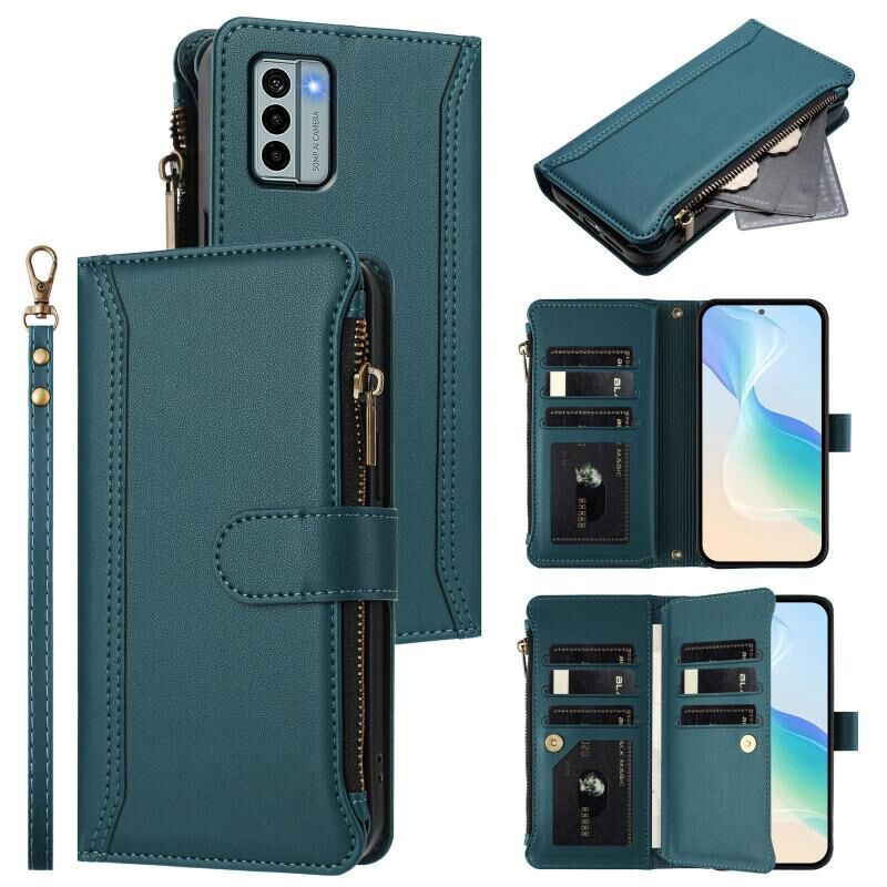 For Nokia G22 Magnetic Closure 9 Card Slots Zipper Leather Case with Hand Strap(Dark Green)