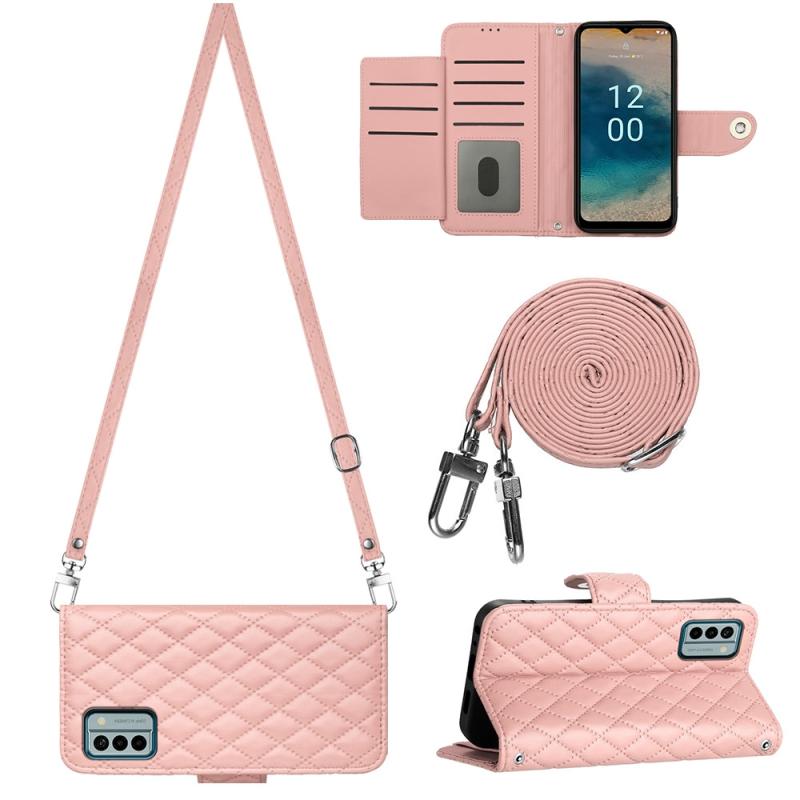 For Nokia G22 Rhombic Texture Flip Leather Phone Case with Long Lanyard(Coral Pink)