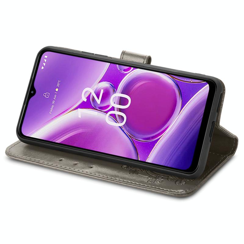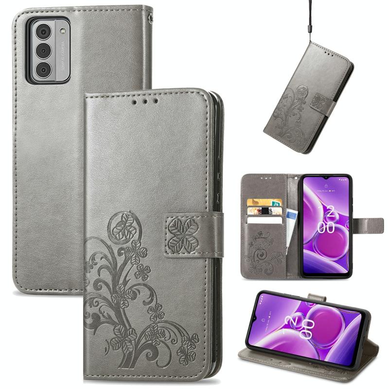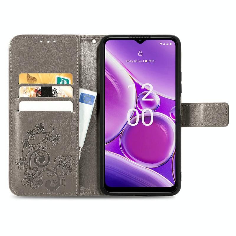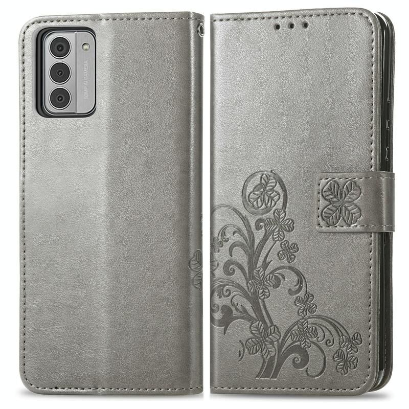 Για Nokia G42 Δερμάτινη Θήκη με Έμβοση και Κούμπωμα Τριφύλλι (Γκρι)