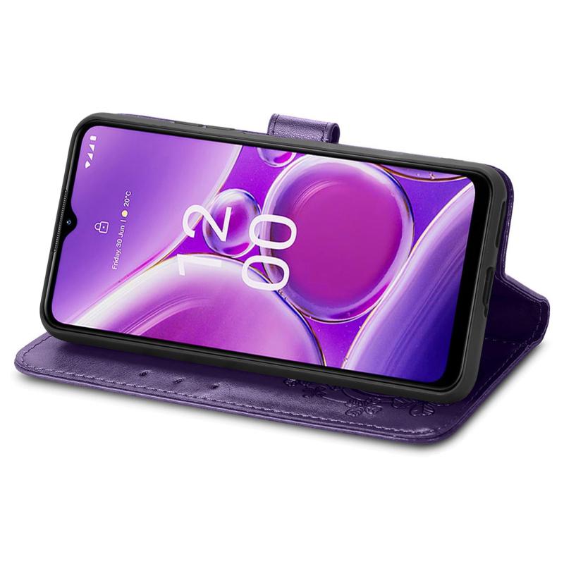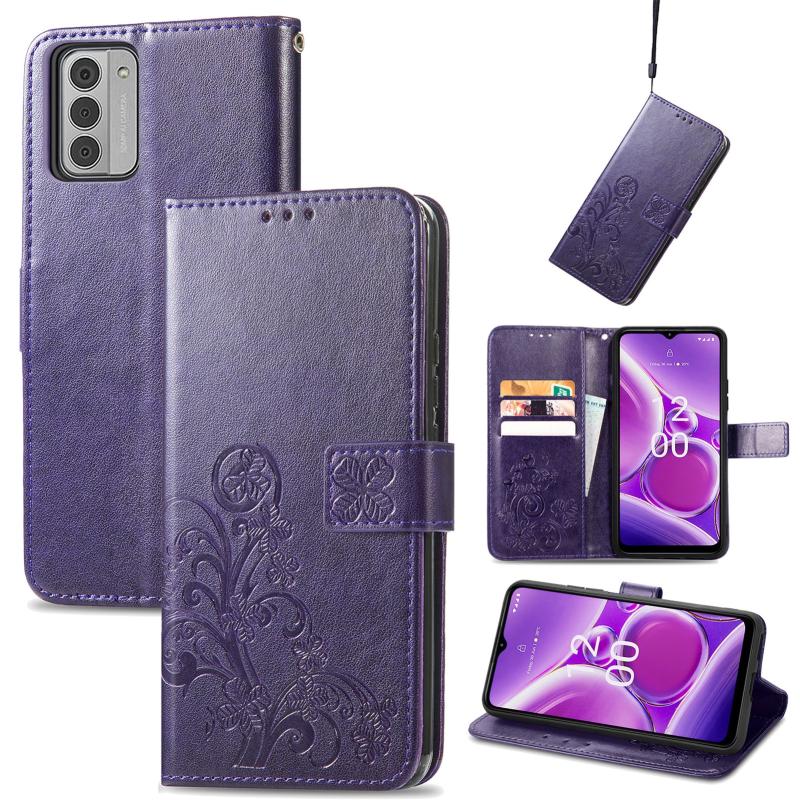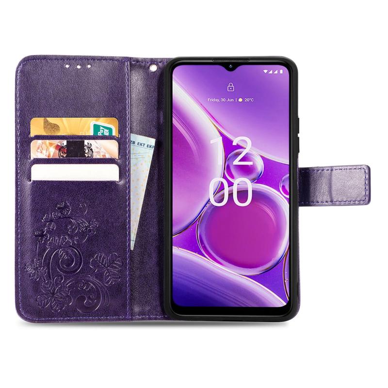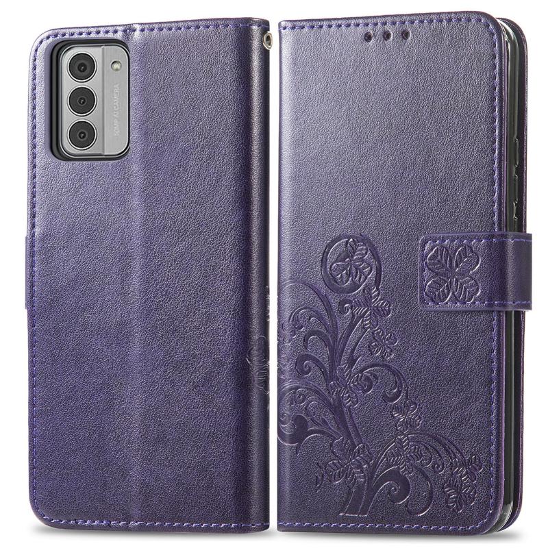 Για Nokia G42 Δερμάτινη Θήκη με Έμβοση και Κούμπωμα Τριφύλλι (Μωβ)