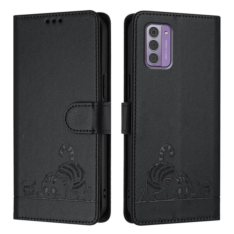 Θήκη τηλεφώνου από δέρμα με ανάγλυφο σχέδιο γάτας και ποντικιού για Nokia G42 / G310 με κορδόνι (Μέντας Πράσινο)