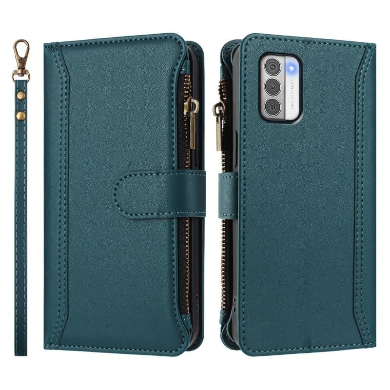 For Nokia G42 / G310 Magnetic Closure 9 Card Slots Zipper Leather Case with Hand Strap(Dark Green)