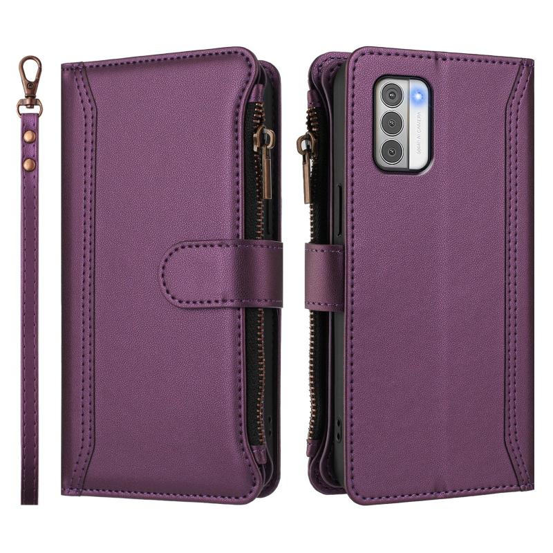For Nokia G42 / G310 Magnetic Closure 9 Card Slots Zipper Leather Case with Hand Strap(Purple)