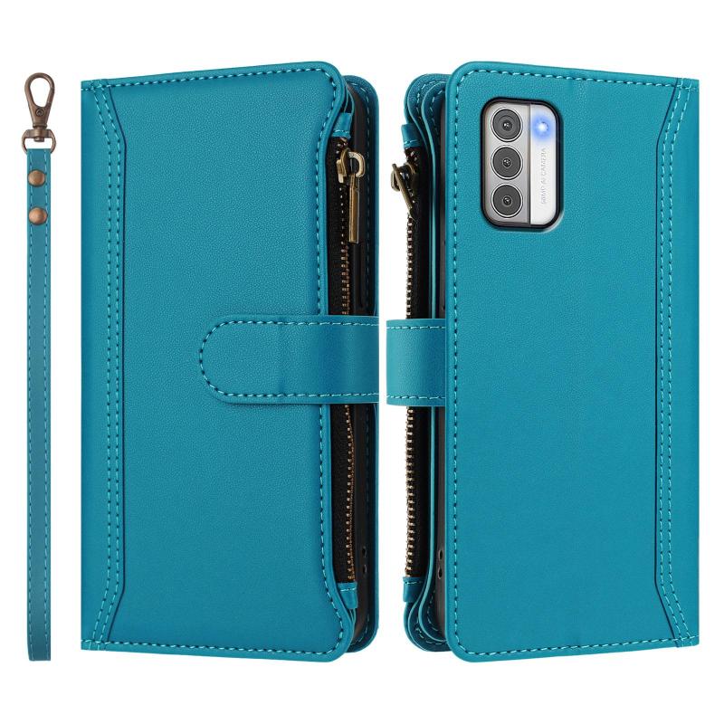 For Nokia G42 / G310 Magnetic Closure 9 Card Slots Zipper Leather Case with Hand Strap(Turquoise)