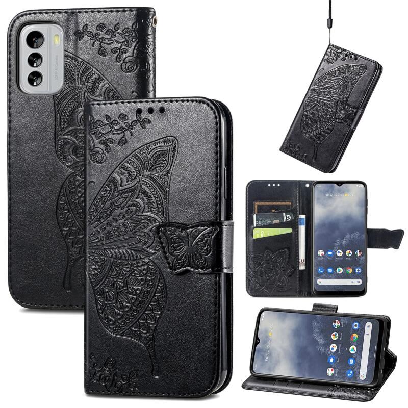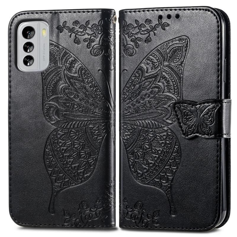 Θήκη δέρματος οριζόντιας αναδίπλωσης για Nokia G60 με ανάγλυφο σχέδιο πεταλούδας, λουλουδιών, βάση στήριξης / υποδοχή κάρτας / πορτοφόλι / κορδόνι (Μαύρο)