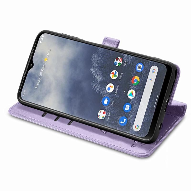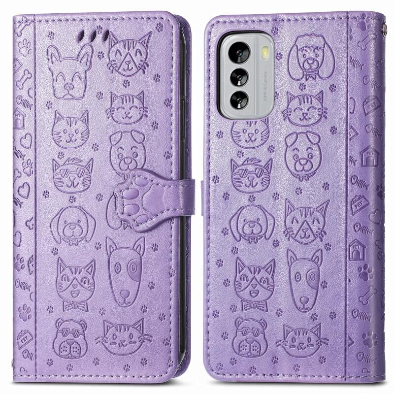 Θήκη τηλεφώνου από δέρμα με ανάγλυφα σχέδια γατιού και σκύλου για Nokia G60 (Μωβ)