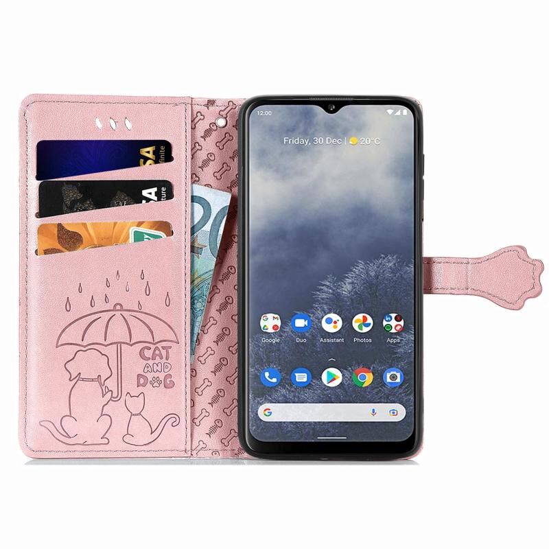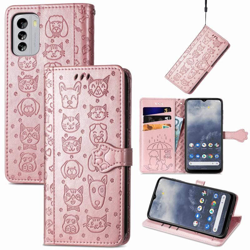 Θήκη τηλεφώνου από δέρμα με ανάγλυφα σχέδια γατιού και σκύλου για Nokia G60 (Μωβ)