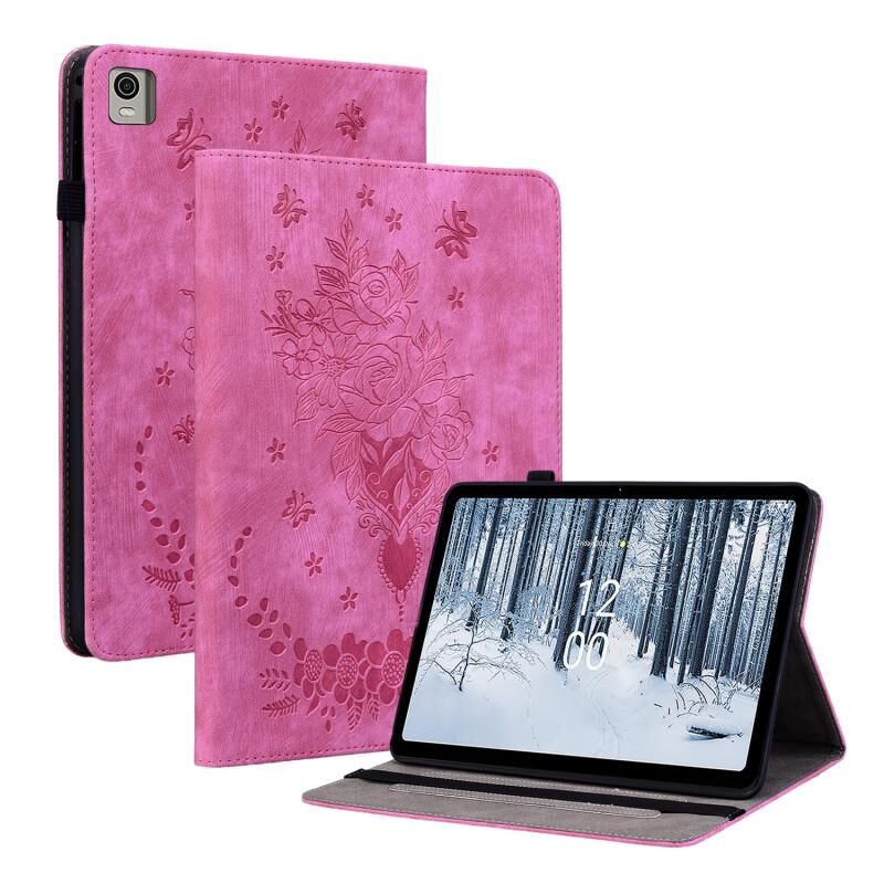 Θήκη ταμπλέτας από δέρμα με ανάγλυφο σχέδιο πεταλούδας για Nokia T21 (Ροζέ κόκκινο)