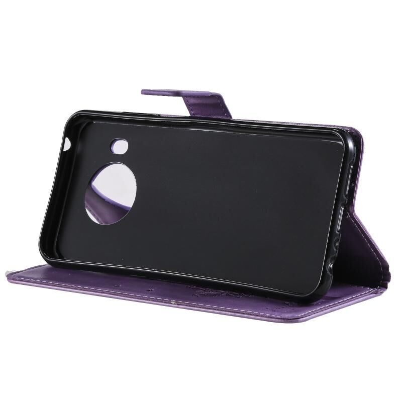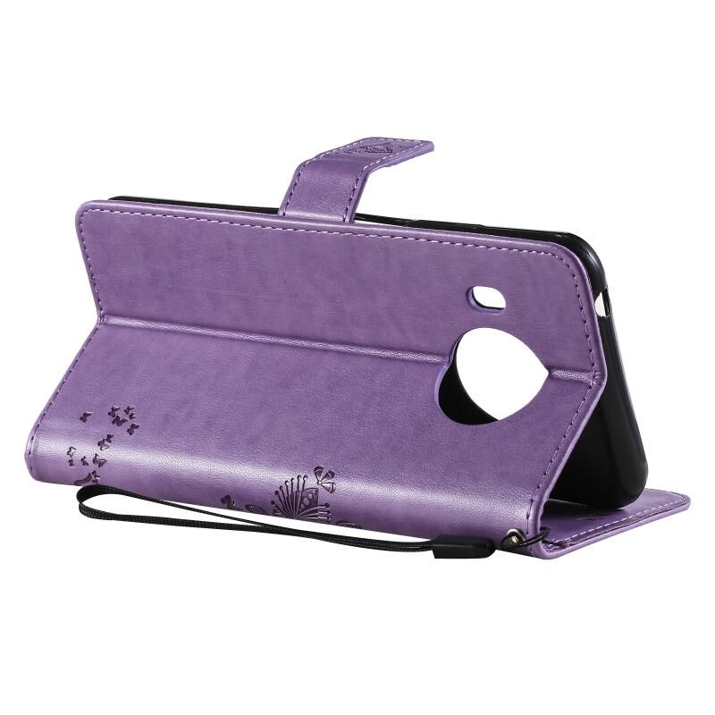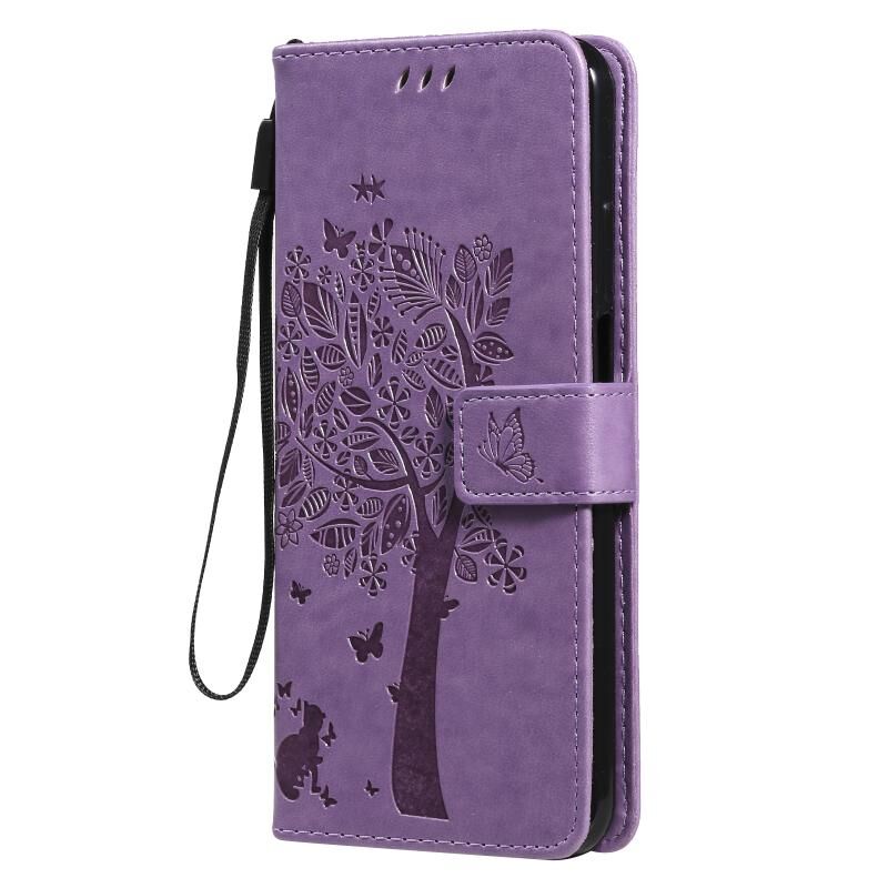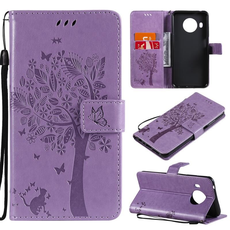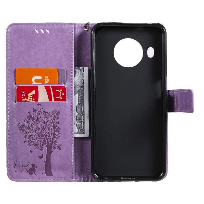 Για το Nokia X10 Tree & Cat Pattern Pressed Printing Horizontal Flip PU Leather Case με θήκη & υποδοχές για κάρτες & πορτοφόλι & κορδόνι (λεβάντα)