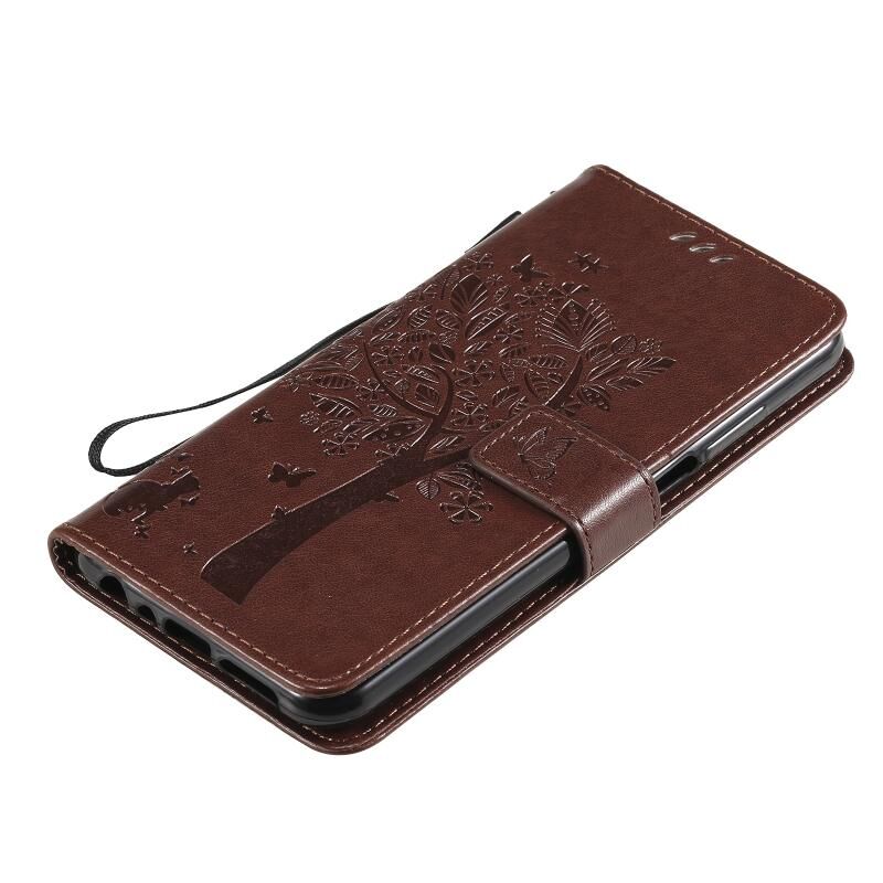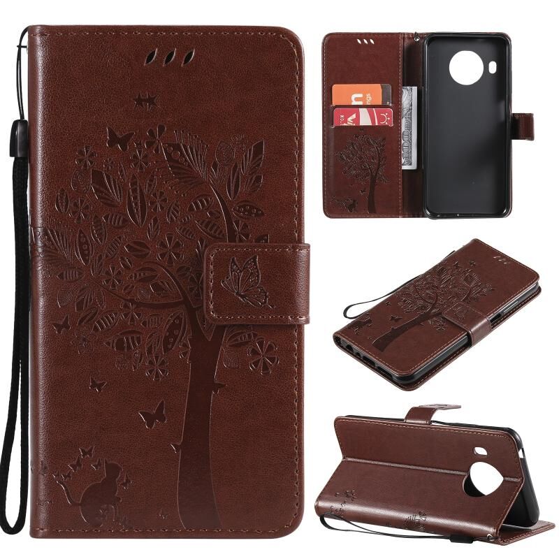 Για το Nokia X20 Tree & Cat Pattern Pressed Printing Horizontal Flip PU Leather Case με θήκη & υποδοχές για κάρτες & πορτοφόλι & κορδόνι (καφέ)