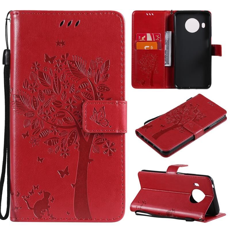 Για το Nokia X20 Tree & Cat Pattern Pressed Printing Horizontal Flip PU Leather Case με θήκη & υποδοχές για κάρτες & πορτοφόλι & κορδόνι (κόκκινο)