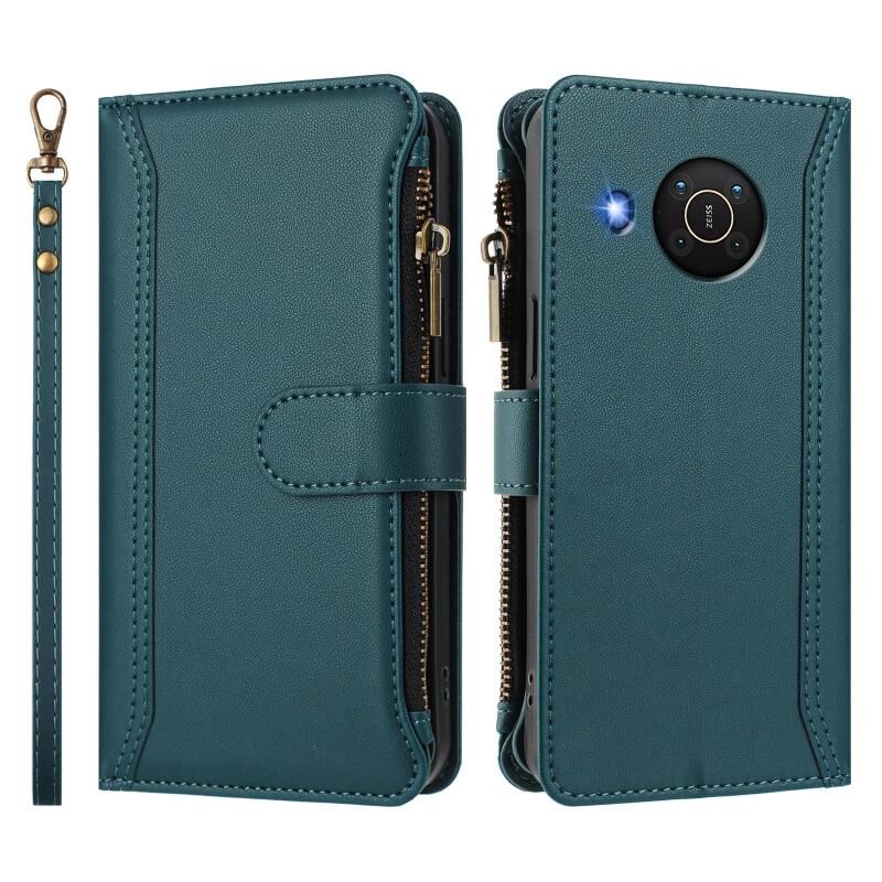For Nokia X20 / X10 Magnetic Closure 9 Card Slots Zipper Leather Case with Hand Strap(Dark Green)