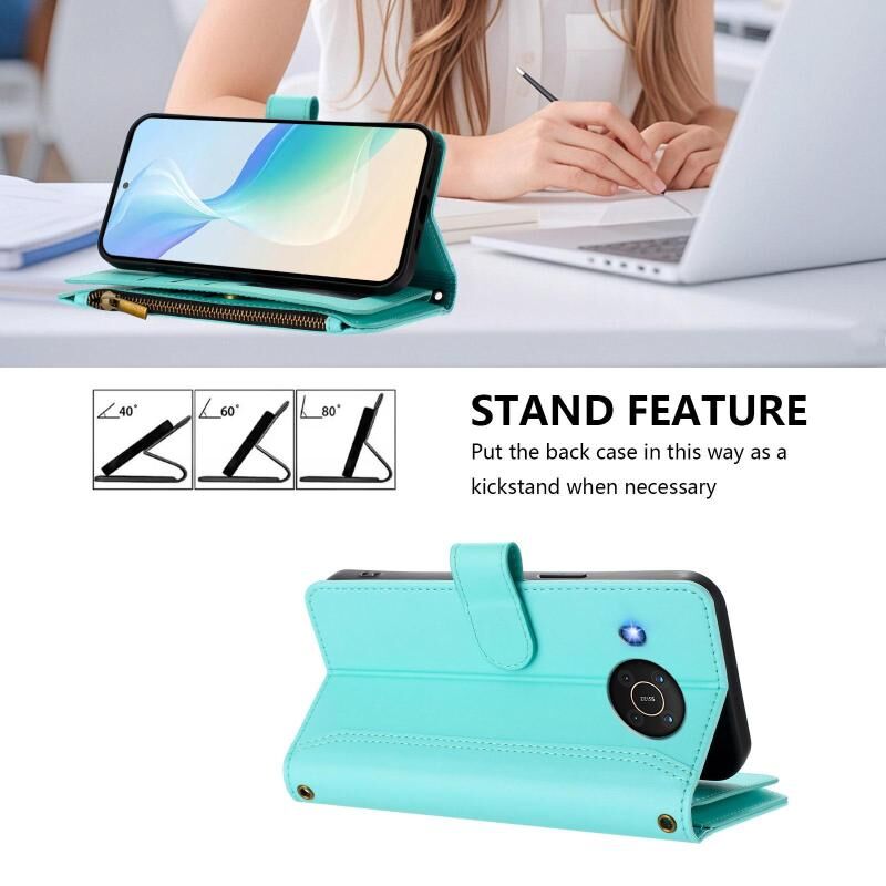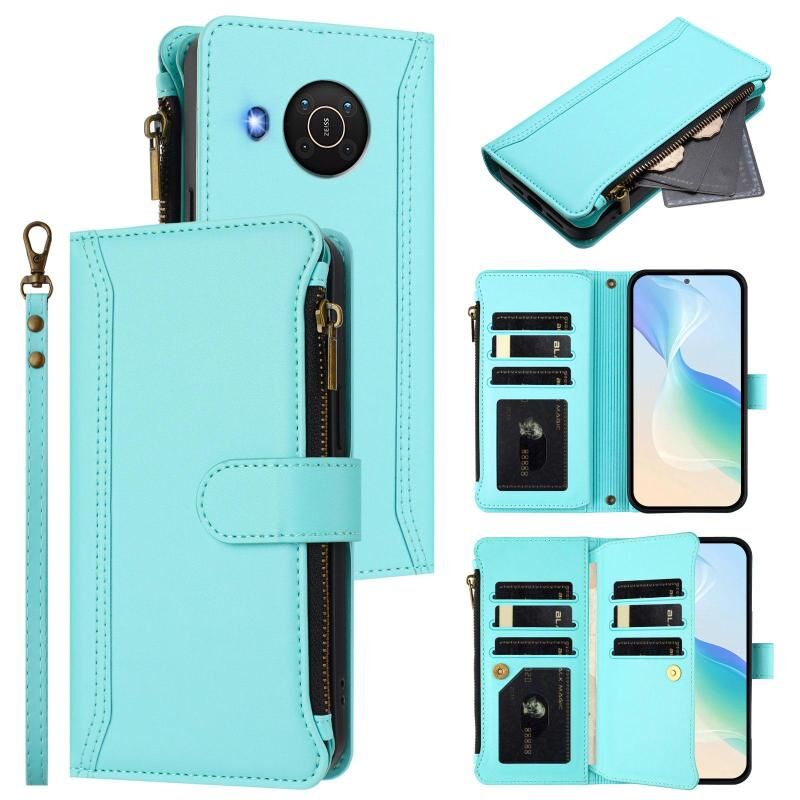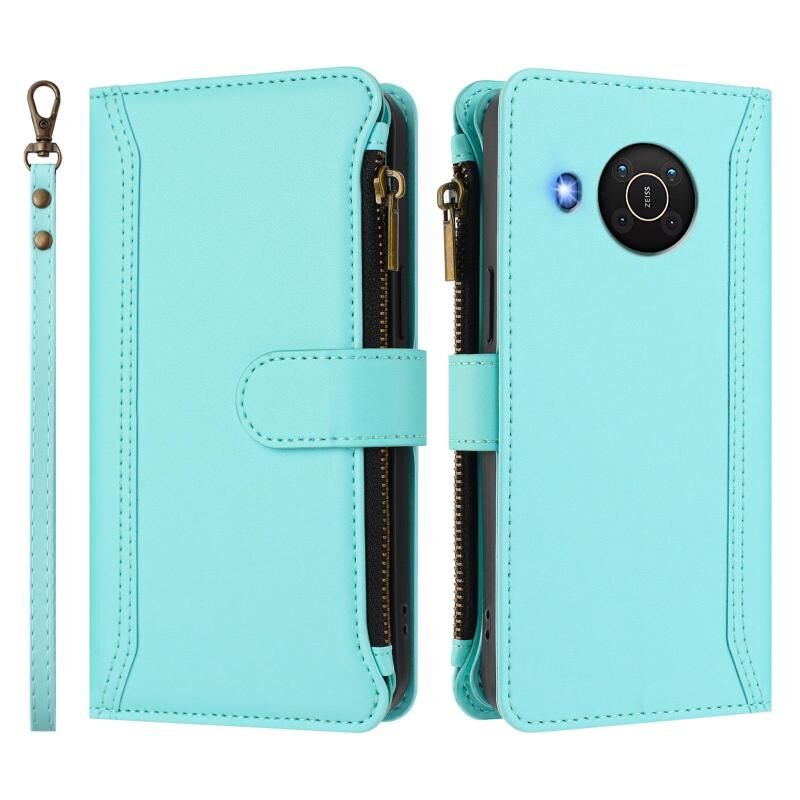 For Nokia X20 / X10 Magnetic Closure 9 Card Slots Zipper Leather Case with Hand Strap(Mint Green)