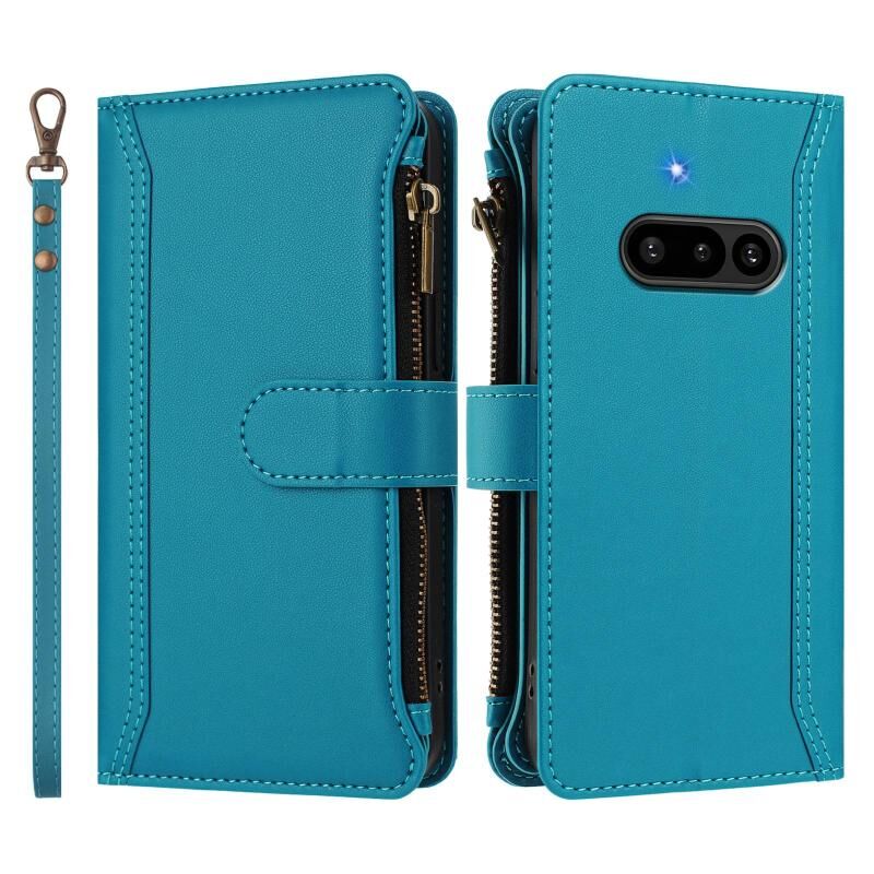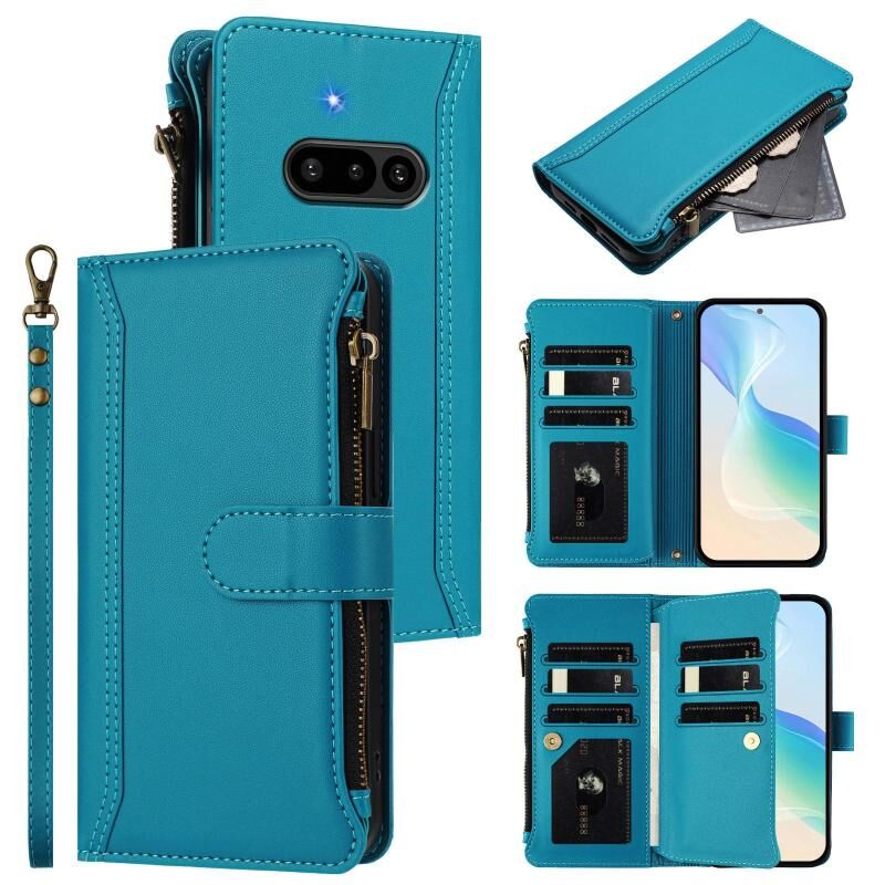 For Nothing Phone 3a Magnetic Closure 9 Card Slots Zipper Leather Case with Hand Strap(Turquoise)