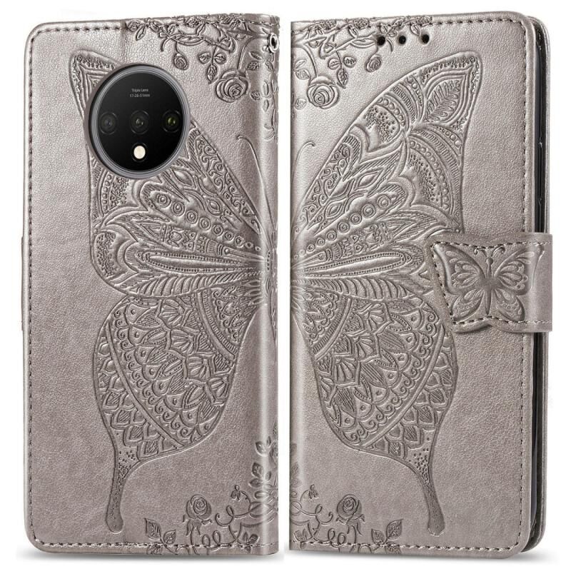 For One Plus 7T Butterfly Love Flower Embossed Horizontal Flip Leather Case with Bracket Lanyard Card Slot Wallet(Gray)