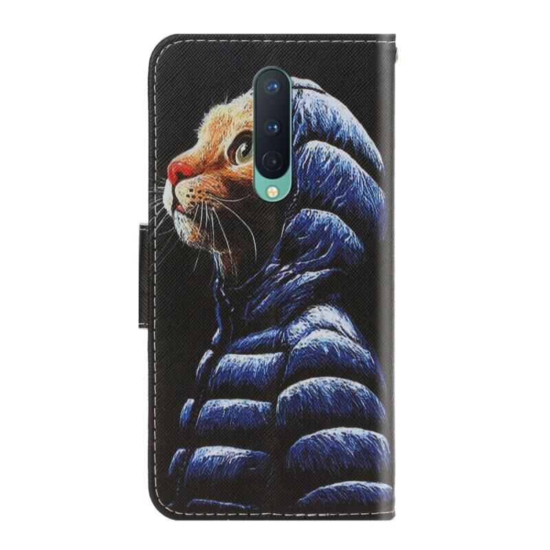 Θήκη δέρματος οριζόντιας αναδίπλωσης με βάση & υποδοχή κάρτας & πορτοφόλι για One Plus 8 (Γάτα με πουπουλένιο μπουφάν)