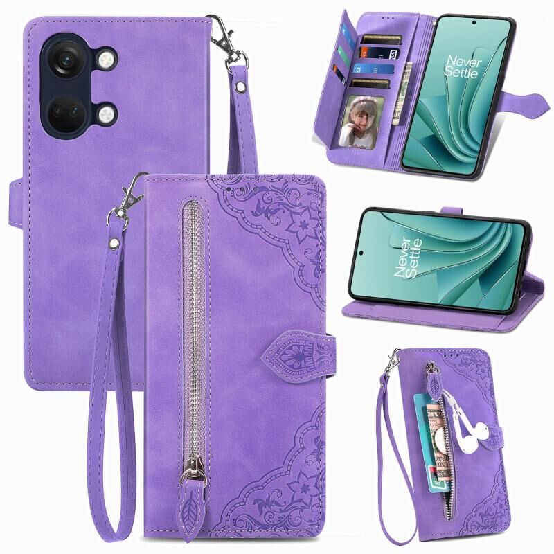 Για One Plus Ace 2V ανάγλυφο λουλούδι φερμουάρ δερμάτινη θήκη τηλεφώνου (μωβ)
