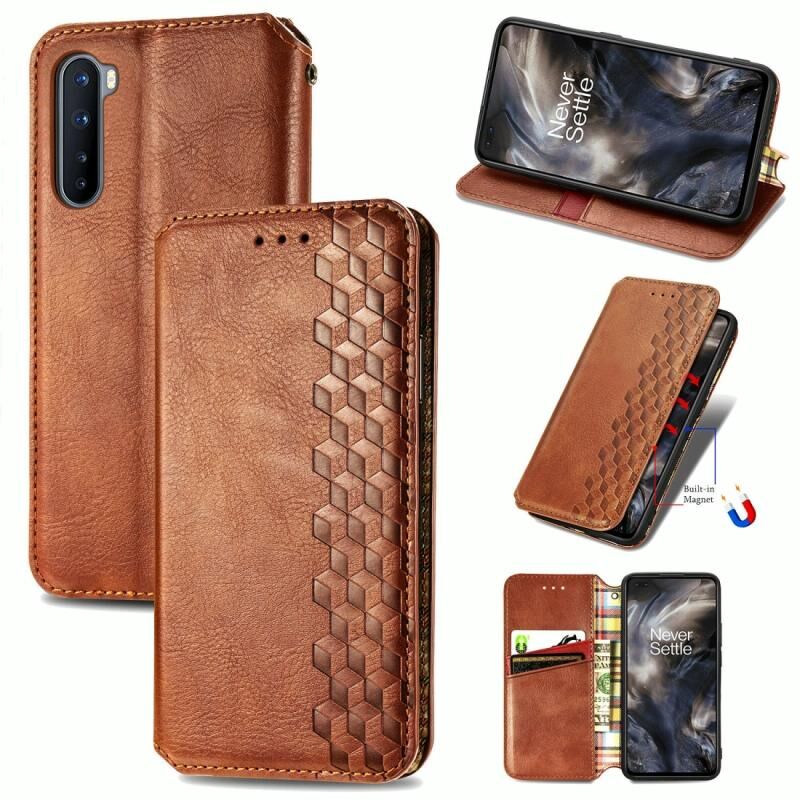 Για το One Plus Nord Cubic Grid Pressed Horizontal Flip Μαγνητική PU δερμάτινη θήκη με θήκη για κάρτες & υποδοχές & πορτοφόλι (καφέ)