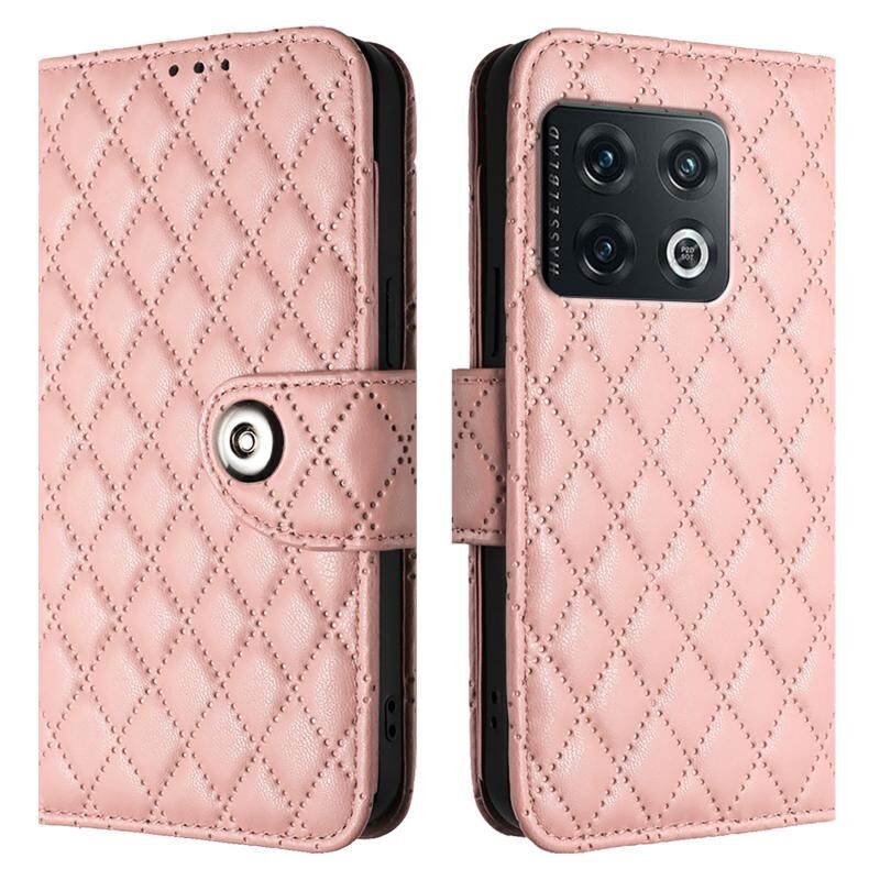 Για OnePlus 10 Pro Rhombic Texture Flip υπόθεση τηλεφώνου δέρμα με κορδόνι (Coral Pink)