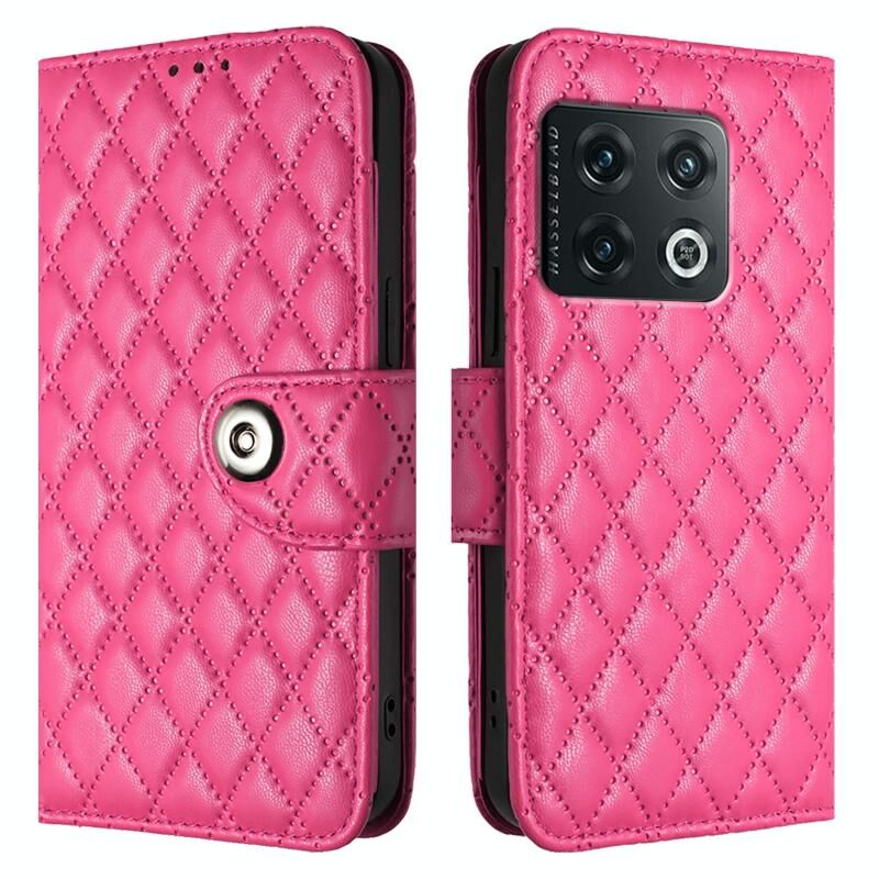 Για OnePlus 10 Pro Rhombic Texture Flip υπόθεση τηλεφώνου δέρμα με κορδόνι (Rose Red)
