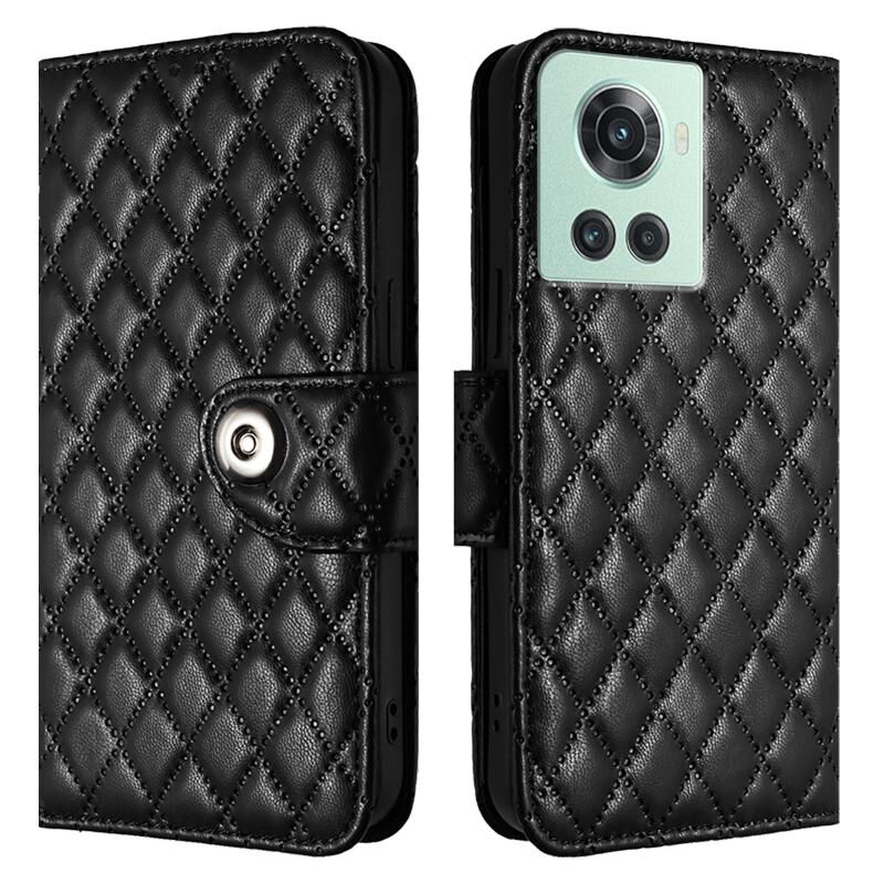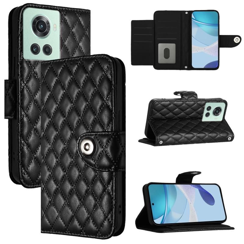 Για OnePlus 10R / Ace Rhombic υφή Flip δερμάτινη θήκη τηλεφώνου με κορδόνι (μαύρο)