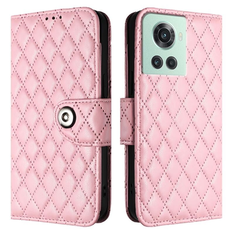 Για OnePlus 10R / Ace Rhombic υφή Flip υπόθεση τηλεφώνου δέρμα με κορδόνι (ροζ)
