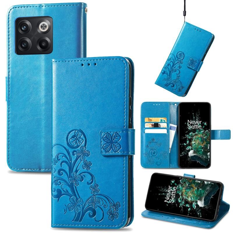 Για OnePlus 10T Τέσσερα φύλλα κούμπωμα ανάγλυφο πόρπη δερμάτινη θήκη τηλεφώνου (μπλε)