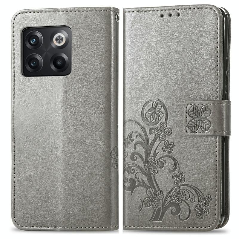 Για OnePlus 10T Τέσσερα φύλλα κούμπωμα ανάγλυφο πόρπη δερμάτινη θήκη τηλεφώνου (γκρι)