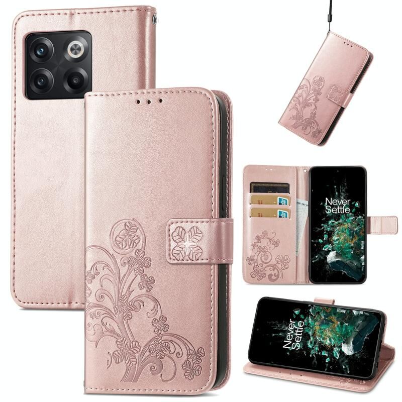 Για OnePlus 10T Τέσσερα φύλλα κούμπωμα ανάγλυφο αγκράφα δερμάτινη θήκη τηλεφώνου (Rose Gold)